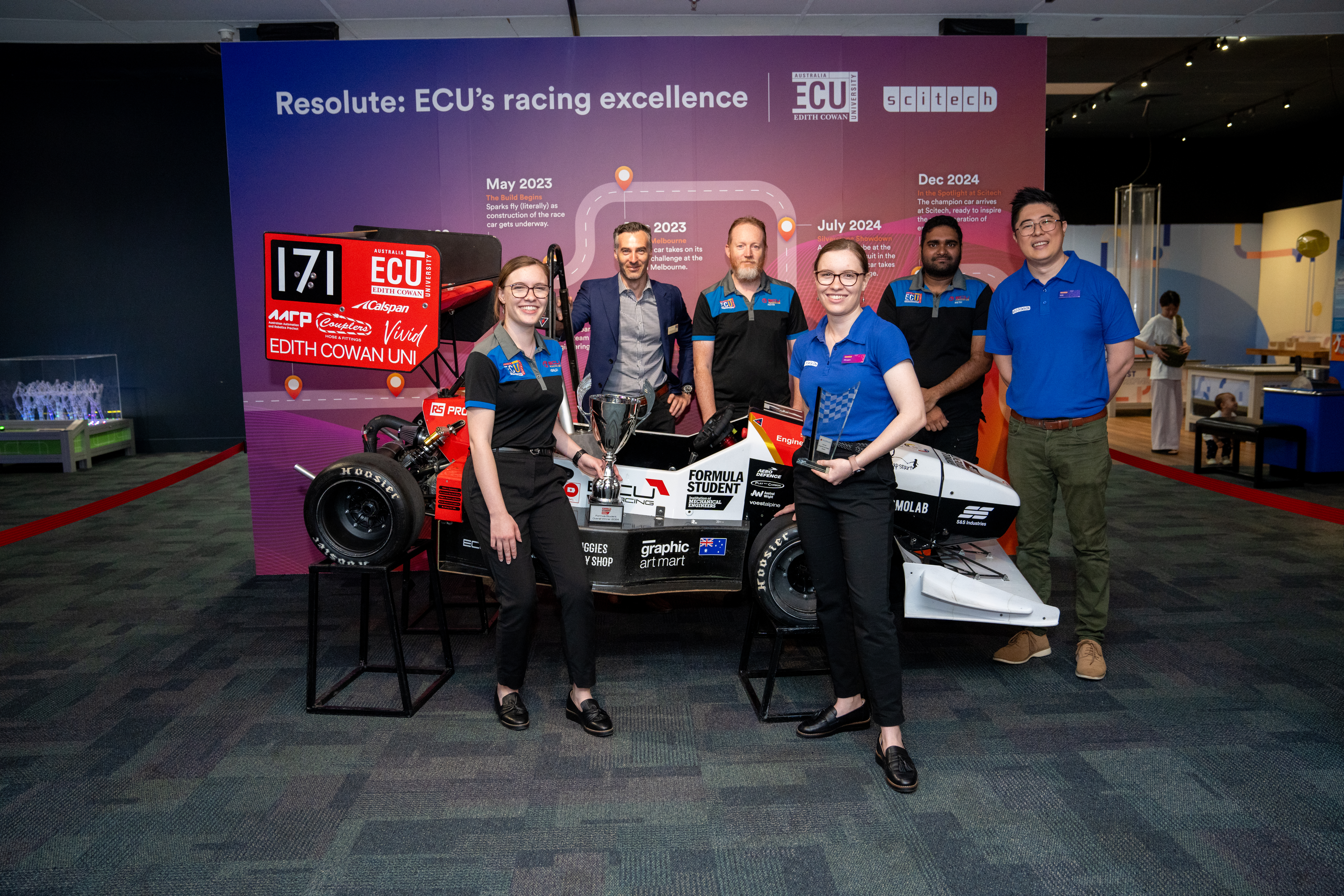 From December 2024 to January 2025, the Scitech Discovery Centre hosted ECU Racing Team’s custom-built Wilson Resolute race car, which took the top spot at Formula Student 2024 in the UK.