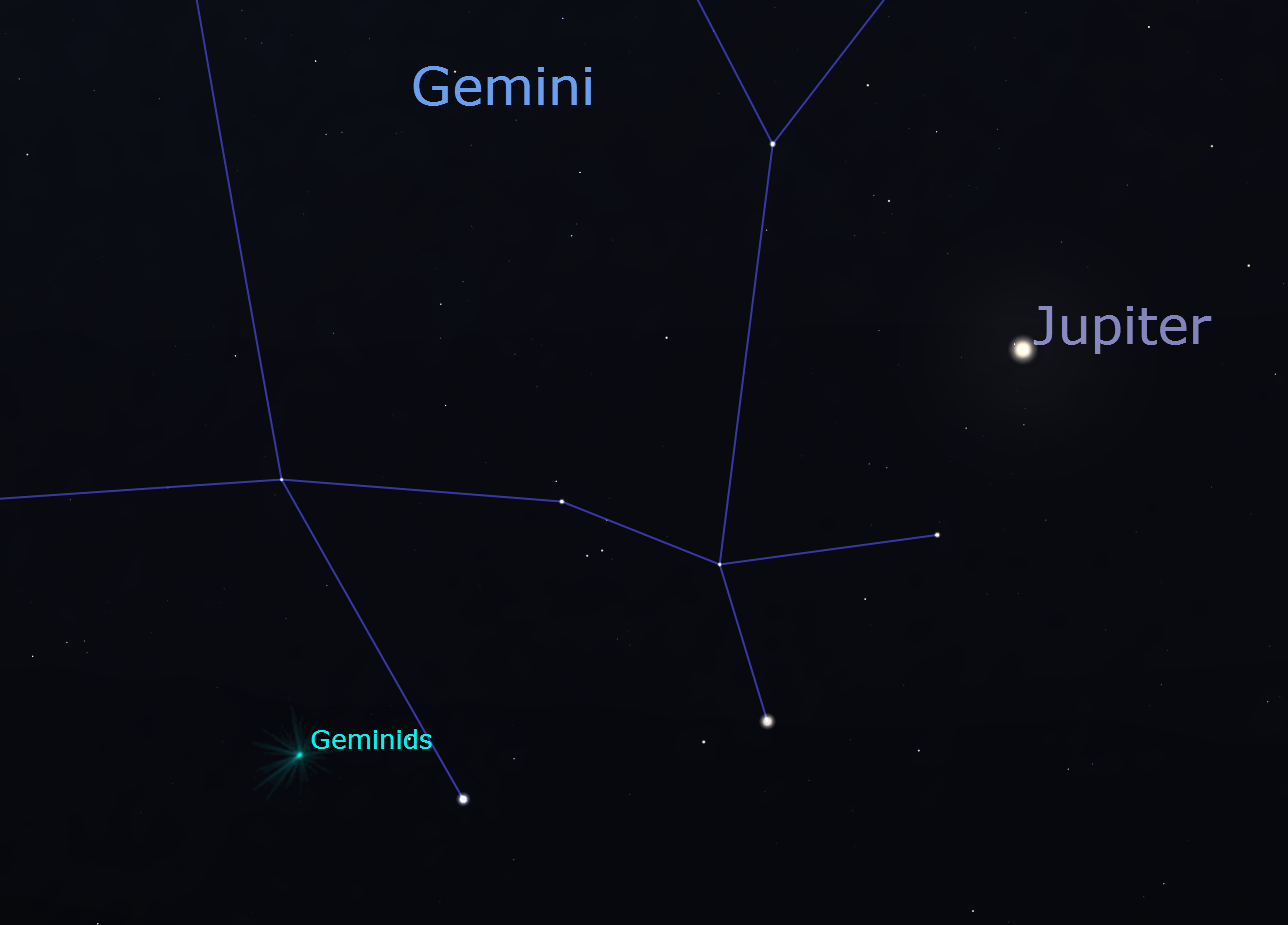 Image: Gemini and the Geminids, with Jupiter for reference. Credit: Stellarium