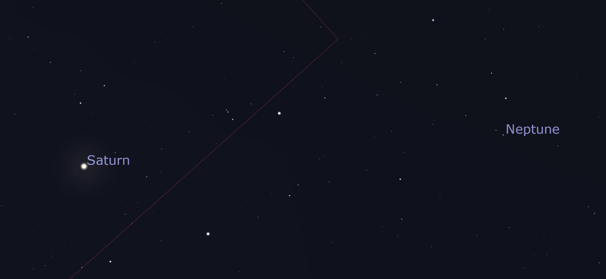 Image: Neptune and Saturn in the December sky separated by about 5 degrees, with the boundary of Pisces shown in red. Credit: Stellarium.
