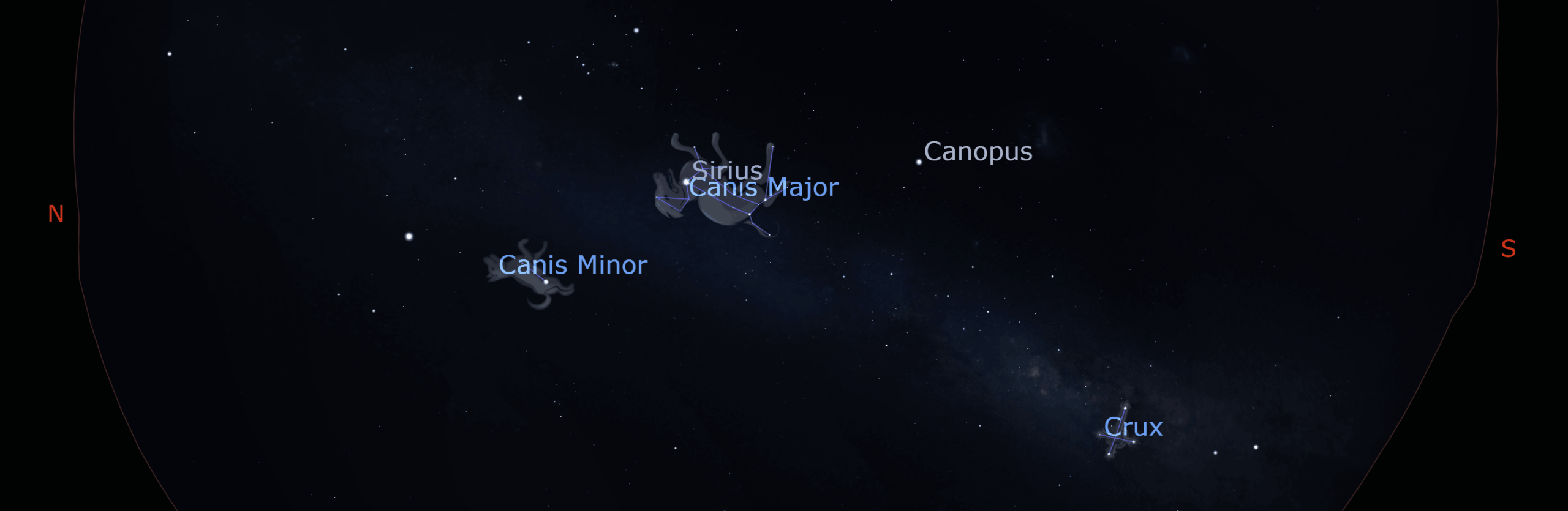 Option 1 is to follow Sirius to the north to find Orion and the hunting dogs, Canis Major and Canis Minor. Option 2 is to follow Canopus to the south catching a glimpse of the Magellanic Clouds (if you are far away from city lights!) and spotting the Southern Cross, which makes a spirited appearance in the southeastern skies after lurking very low on the southern horizon for the last couple of months.