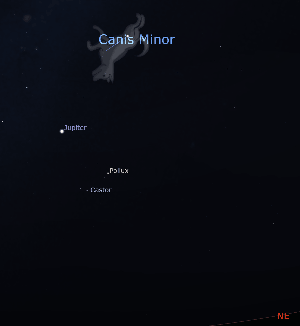 Image: Jupiter in the northeast during February evenings sitting underneath Canis Minor. Credit: Stellarium