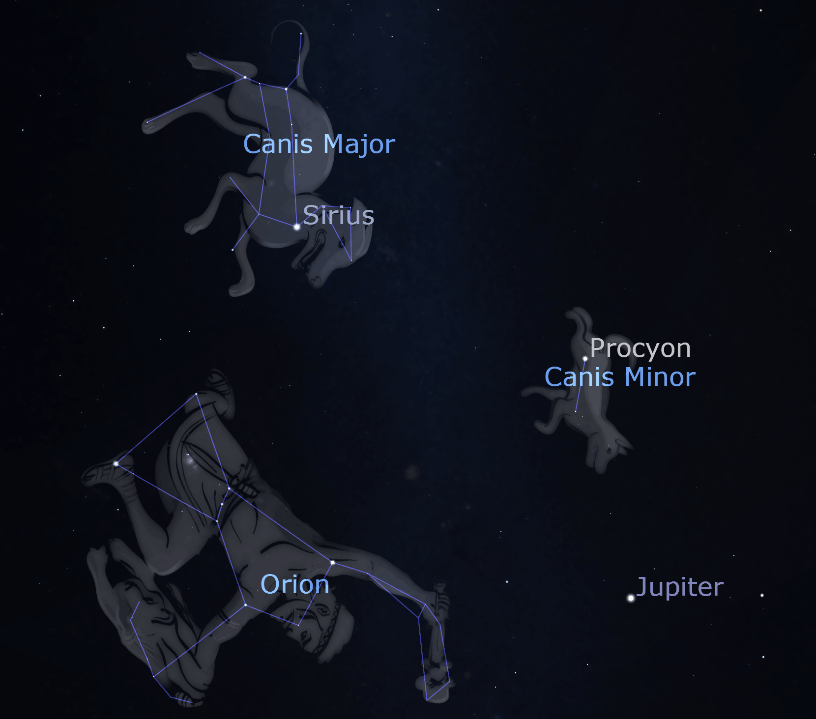 Image: Canis Minor, Canis Major, Orion and Jupiter as seen on February 14. Credit: Stellarium