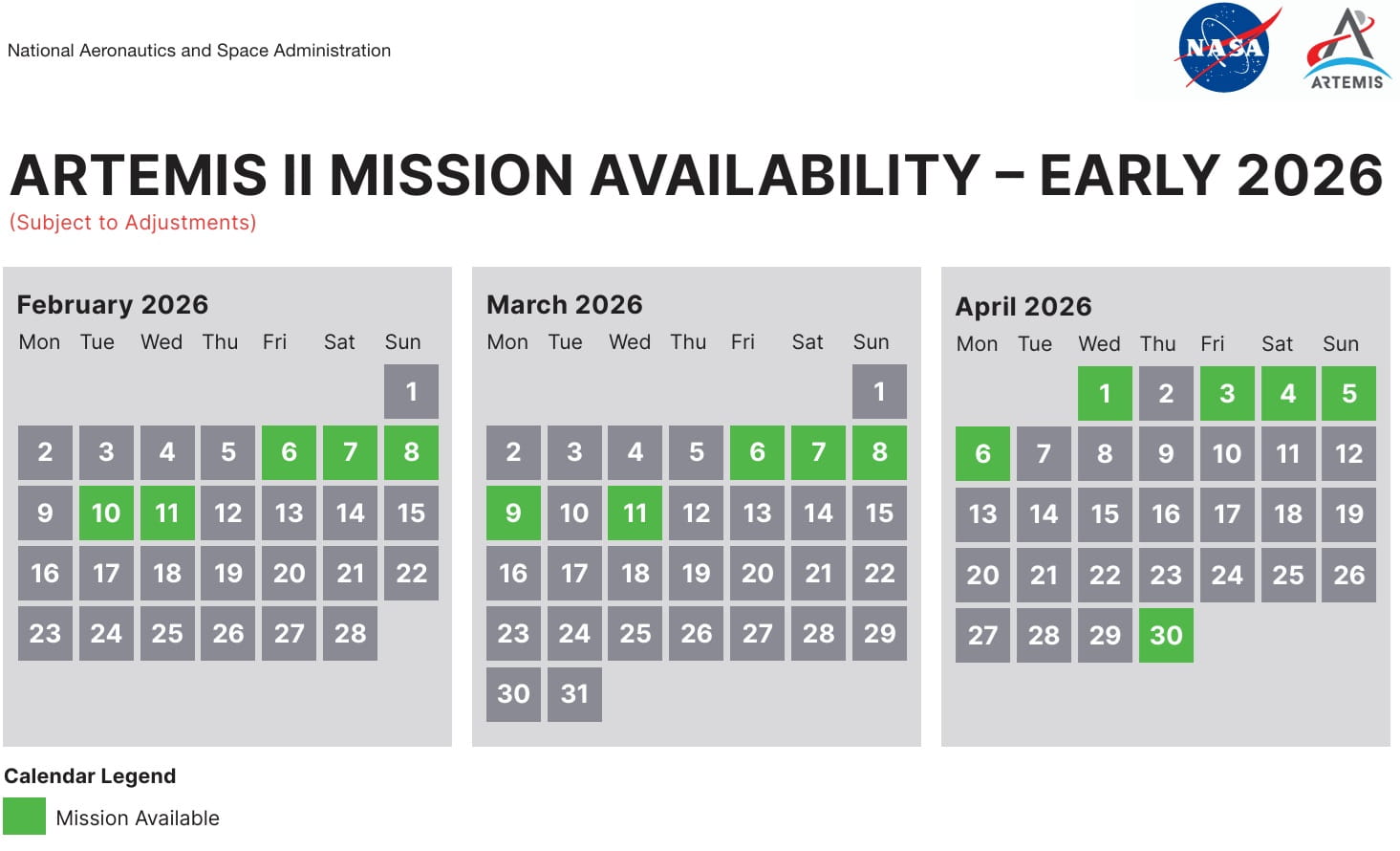 Image: Potential launch dates of Artemis 2 (dated for US Eastern Standard Time). Credit: NASA